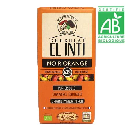Chocolat noir 63 % de cacao, 15 % d’écorces d’oranges confites, huile essentielle d’orange, sucre de canne complet du Pérou (panela), biologique.