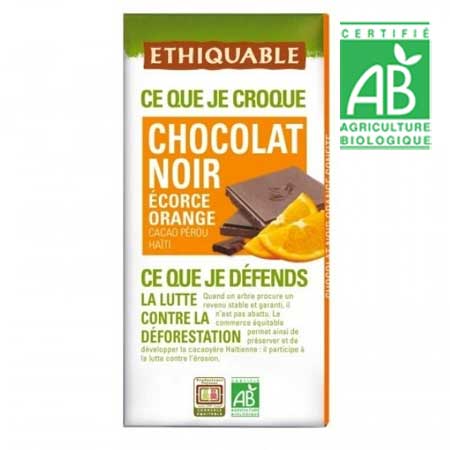 Chocolat noir aux écorces d’orange confites issu du commerce équitable et de l’agriculture biologique