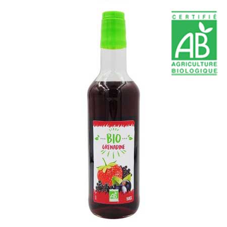Sucre de canne*, eau, jus de fruits à base de concentrés* 10% (cassis*, fraise*, sureau*), acidifiant : acide citrique, arôme naturel de fraise, arôme naturel de vanille, arôme naturel de grenadine*. *Ingrédients issus de l’agriculture biologique.