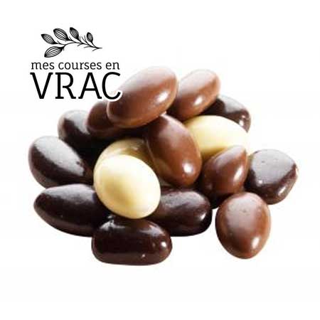 Mélange d’amandes enrobées aux chocolats noir, lait et blanc.